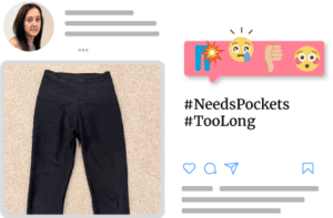 We tasked our research participants with wearing and showing us their workout gear and telling us about it - much like the RushTok craze that took hold a couple years ago. By responding to these research prompts and tasks on their own time and in their own space, we caught them in the moment - fresh from a workout, dressing for yoga class, or rifling through a drawer of fitness apparel. Through selfie videos and images, they showed us their latest purchases and shared the stories that drove their recent apparel purchases. They also showed us what they replaced and described why those items and brands fell out of favor.