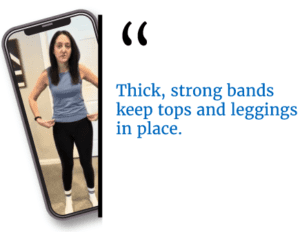High, thick, and strong waistbands are in. They keep bottoms and tops in place without rising or falling. They allow women to transition between activities and offer the same support for both leaning over and reaching upwards.